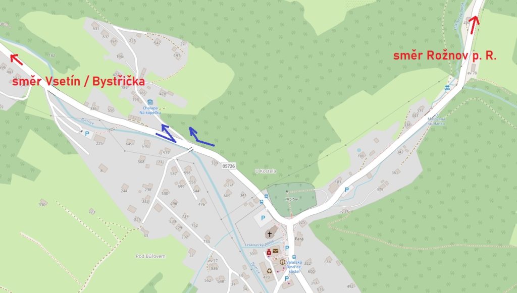 Příjezd od Vsetína/Bystřičky: Projedete kolem opuštěného penzionu Horalka a dále cca po 700 m uvidíte na pravé straně krytý dřevěný most ve valašském stylu. Za tímto mostem ve vzdálenosti cca 150 m je vpravo silniční most přes potok a prudce vlevo se nachází odbočka do kopce, kterou přijedete k chalupě. Chalupa je první stavení vpravo.